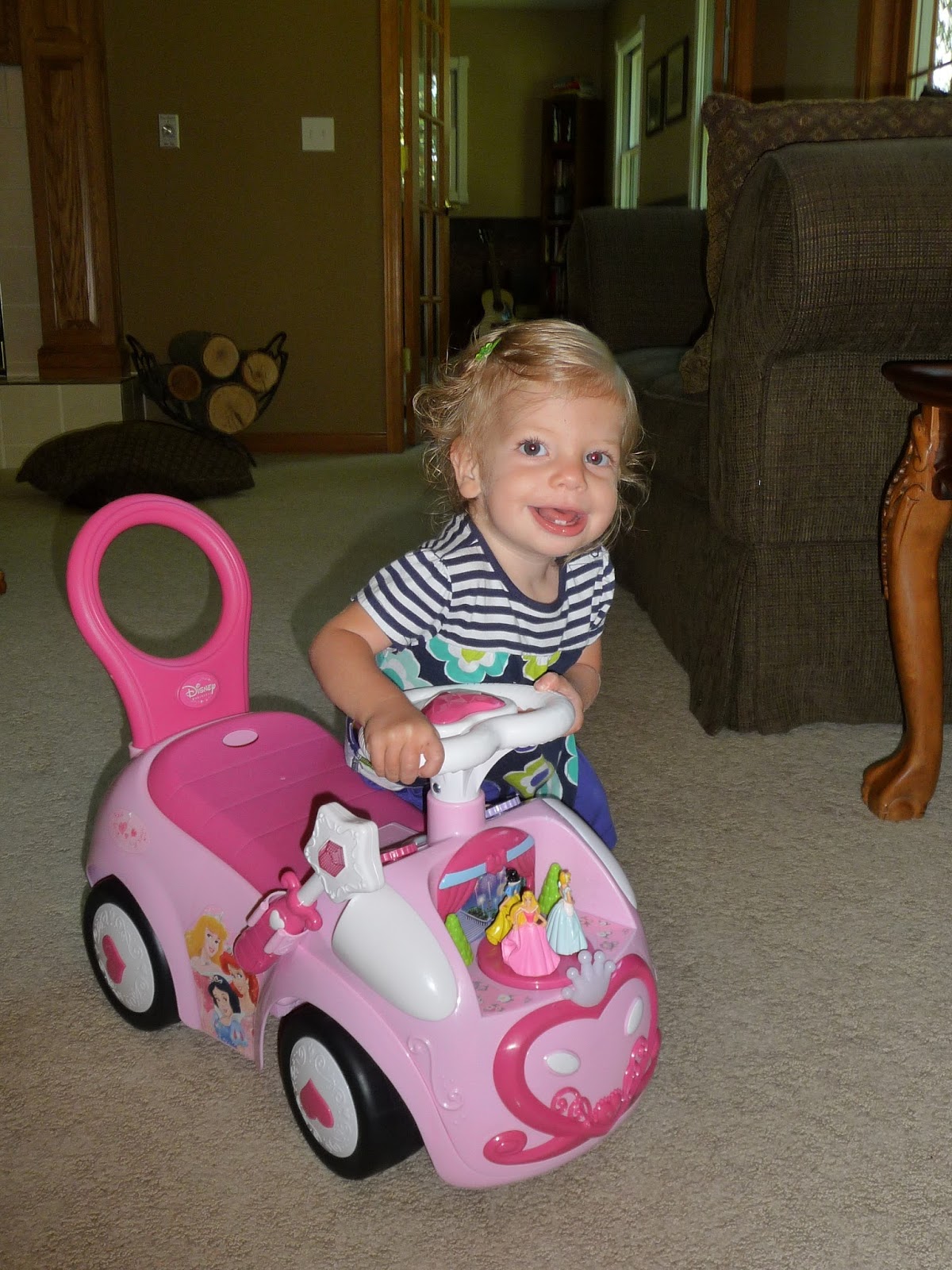 Ellie got this toy last Christmas but because she couldn't even crawl back then we saved it and just got it out in June. She thinks she is pretty cute on it. (but then again I think she is pretty cute too:))